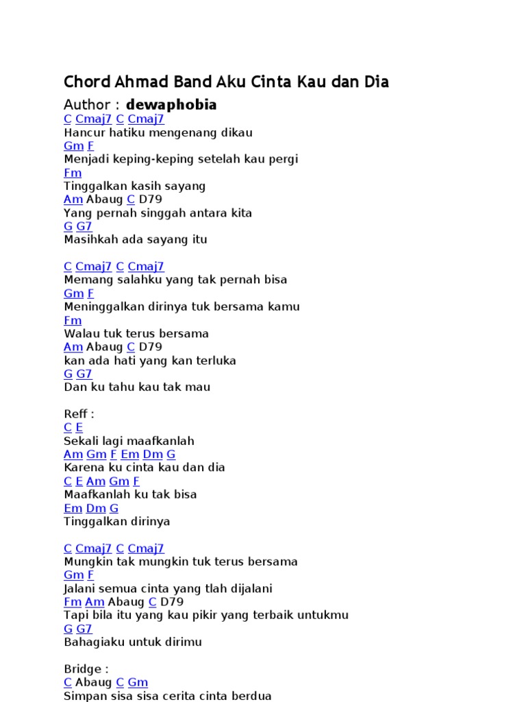 Dan ku tahu kau tak mau reff. Intro d gm d gm 2x d dmaj7 hancur hatiku d dmaj7 mengenang dikau am em menjadi keping keping setelah kau pergi gm tinggalkan kasih sayang bm f bm e yang pernah singgah antara kita a masihkah ada sayang itu d dmaj7 memang salahku d dmaj7 yang tak pernah bisa am em meninggalkan dirinya tuk bersama kamu gm walau tuk trus bersama bm f bm e kan ada hati yang kan terluka a dan ku tahu. Aku cinta kau dan dia munggur says. Original lyrics of aku cinta kau dan dia song by dewa 19.